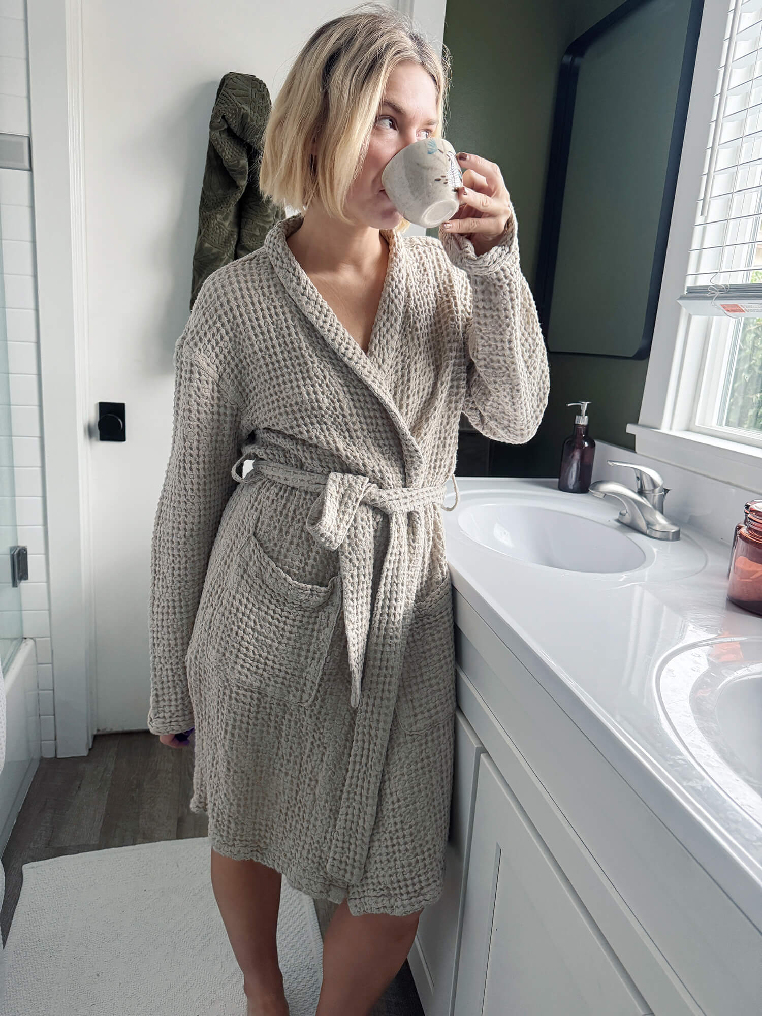 There are certain garments that I never intended to sew myself. We all have them- the “no fly” zone of patterns. For some, it’s bathing suits or basic tee’s. For me…it is athletic clothing or loungewear… like a bathrobe. But here I am – sharing my completed robe experience! I recently made the Capucine Robe, sewn in the IS010 Waffle Pebble fabric from The Fabrics Store. Spoiler alert: it’s a game-changer.