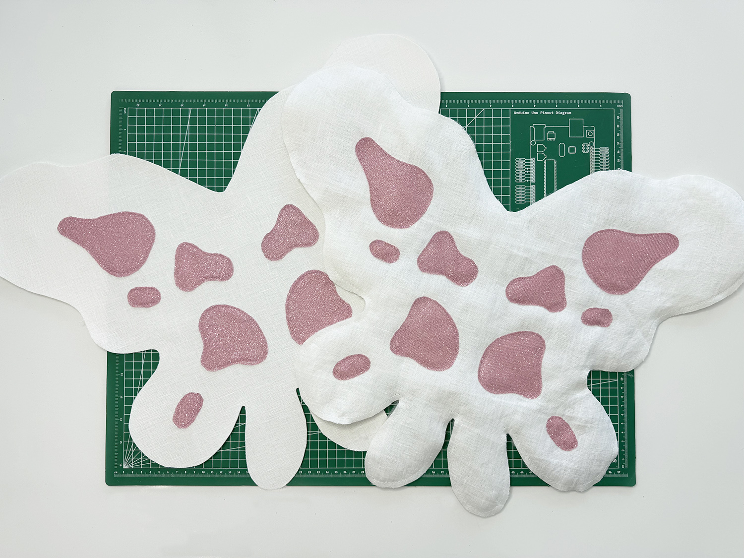 1. Let’s start by figuring out the shape and size of your wings! You can make them anything you want, but just make sure they’re not too big or they’ll weigh you down or sag. If you want this exact pattern, you can find it in our Etsy shop! Once you’ve chosen your pattern, cut it out with a seam allowance of 1.2 inches. Also, cut out the blob shapes in your pattern to make placement easier later! There will be two sections: a ‘FRONT WING’ and a ‘BACK WING’ Section. The ‘FRONT WING’ is the side that faces outwards, while the ‘BACK WING’ is the side that rests on your back.