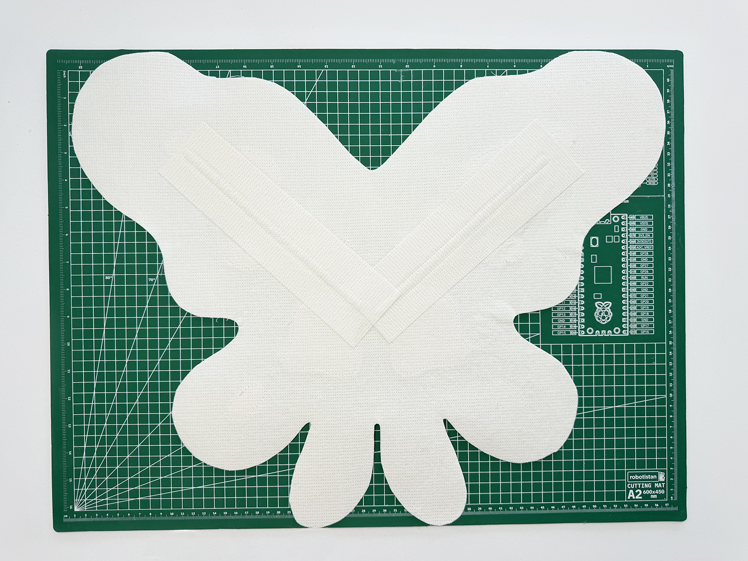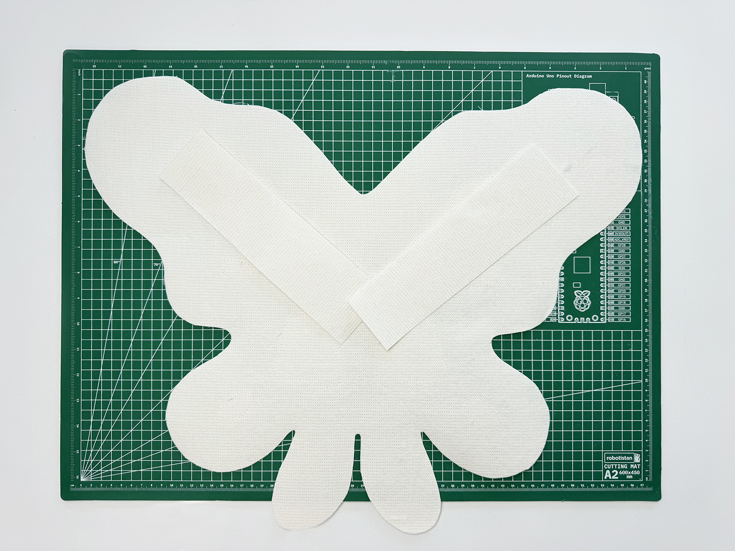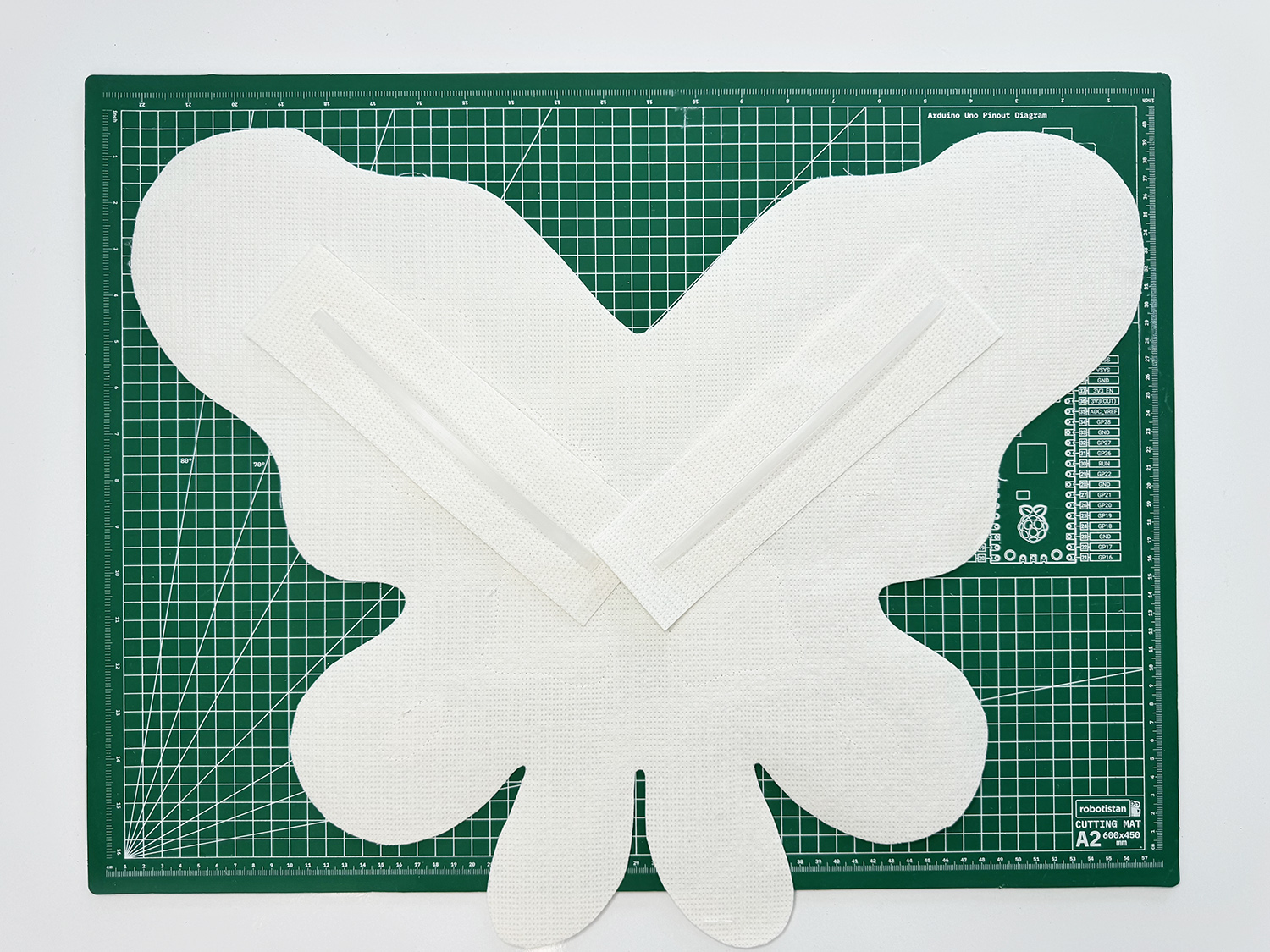 12. This step is optional, but it is a good way to use leftover material and make your project more sturdy! You will probably have some of the stiff interfacing left after cutting out the butterfly. You can use the interfacing scraps to layer onto the top portion of the ‘BACK WING’ to make them stronger. You can also add as much as you like.