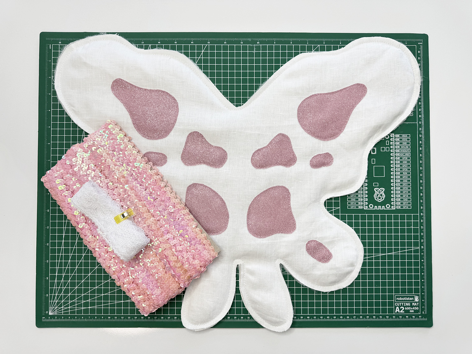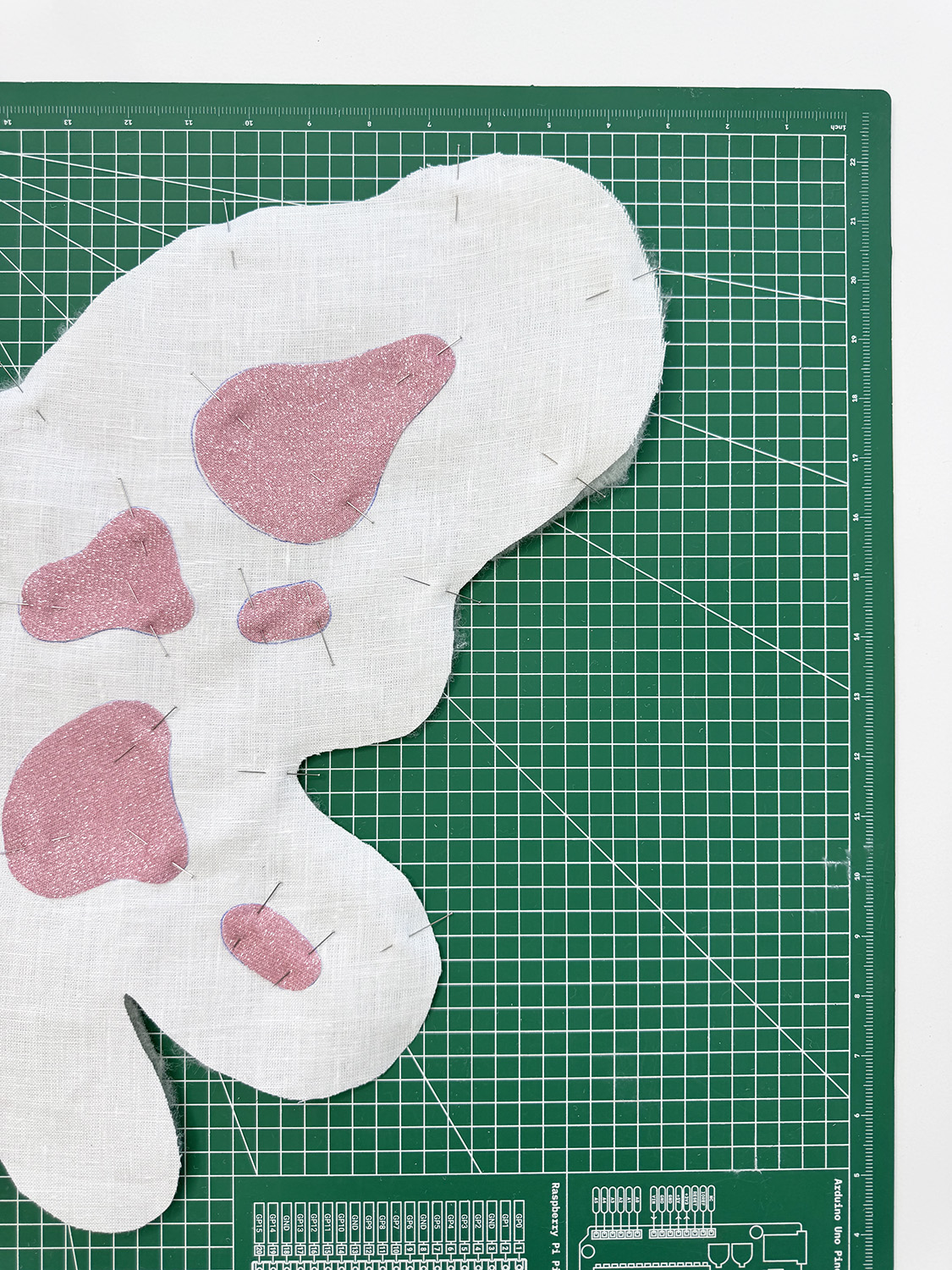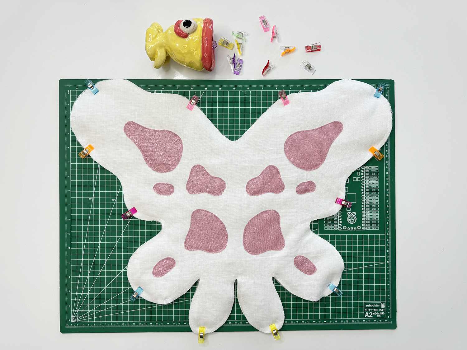 7. This was my favorite part of the process! It was like a fun little puzzle. After cutting out all the blobs, put them in the right places and pin them down. Do this for both the ‘FRONT’ and ‘BACK’ wings.