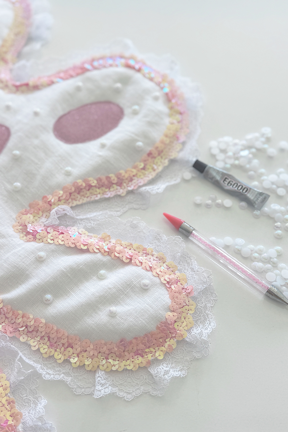 16. You can also add on more texture with some flat back beads. I used E6000 to glue them on. Just make sure you give it some time to set before moving it around. We don’t want all that hard work just to fall off! Also, E6000 is very strong, so try to have an open window while working with it. You can also use a hot glue gun, but it might come off after a while. If you’re only planning to wear it for one night, it should be fine.
