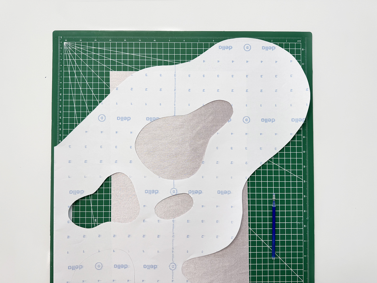 3. After your ‘BACK WING’ is all cut out with the interface ironed on, take the pattern and place it on the fabric. Then, use a fabric pen or marker to trace the blob details. I am using a pen that disappears with heat.