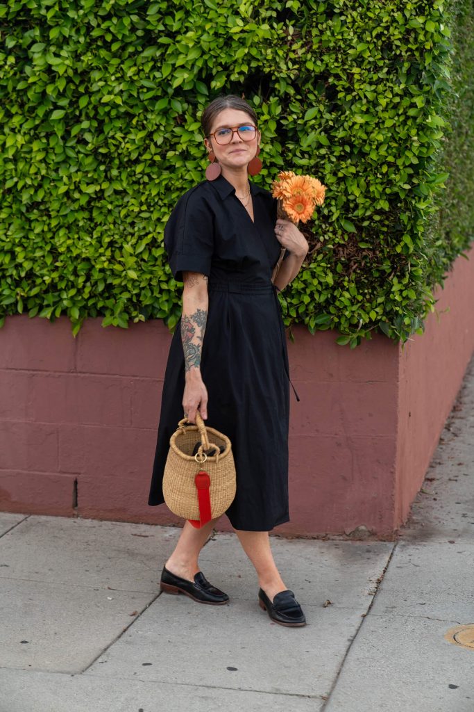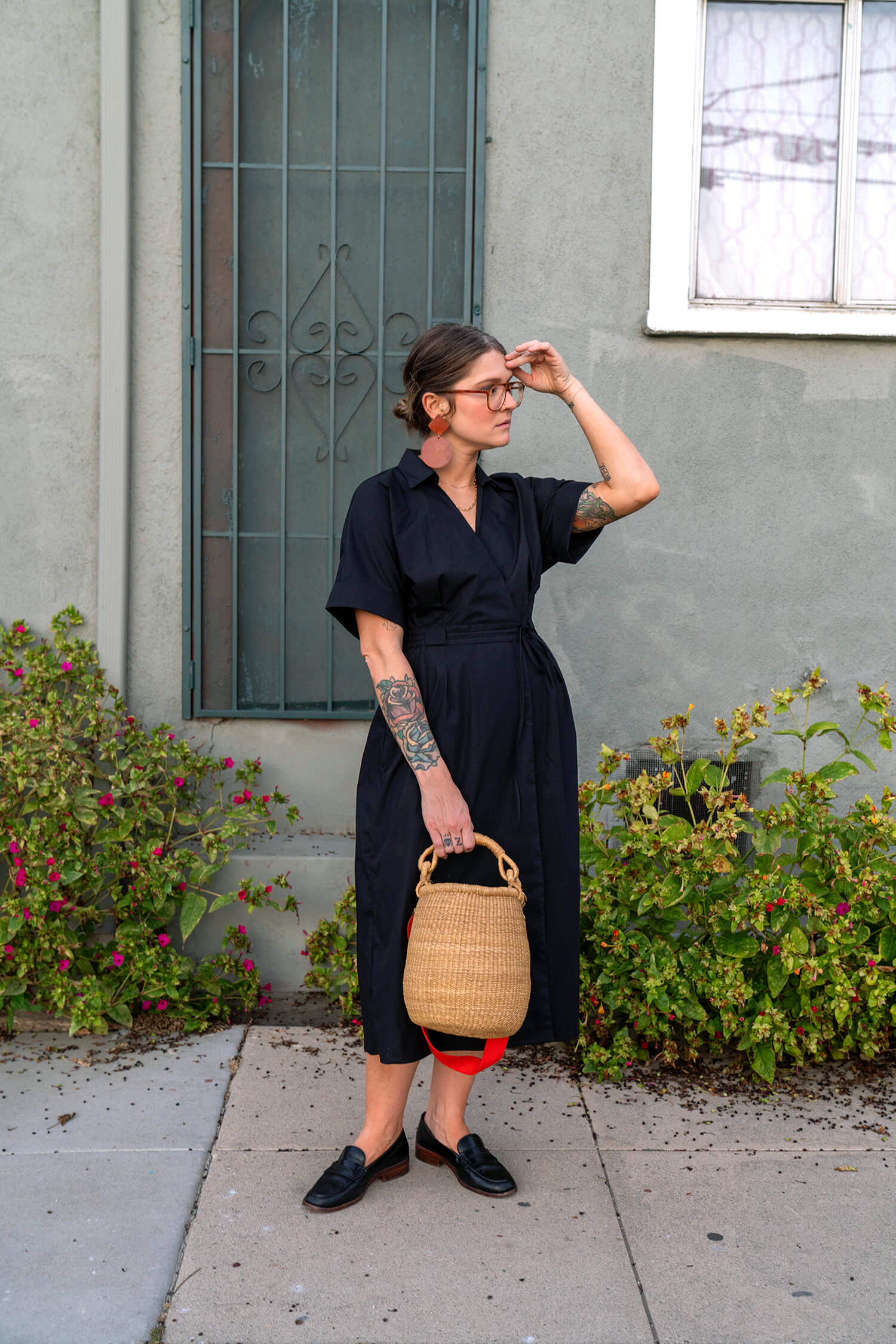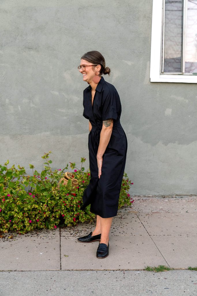 The overall shape is elegant, and in this Cotton Poplin– it is crisp and structured. Although the waist belt is fitted, the bodice has more ease for a very effortless feel. This dress would be absolutely lovely in a lightweight linen for the summer! But it serves its purpose for me this fall: moody and sophisticated; pairs perfectly with loafers.