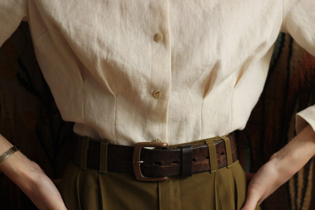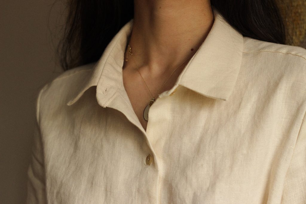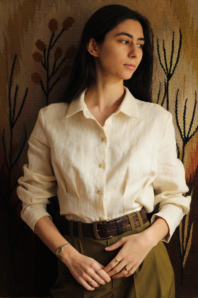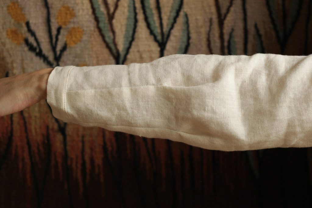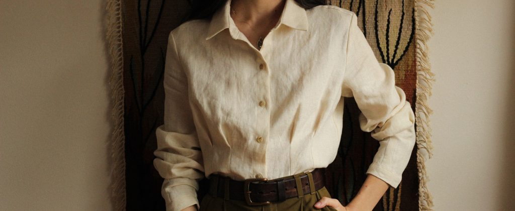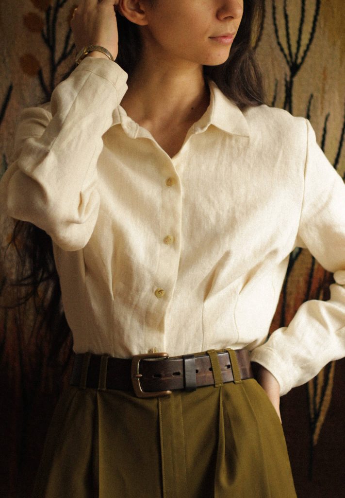 I decided to sew it in the perfect butter yellow toned cream, the Angora Midweight Linen. It has the warmest, glowiest tone to it without being too saturated. A perfect warm toned neutral to wear in these fall days to match with beautiful autumn sunlight! I paired it with my go to buttons – the reverse side of mother of pearl buttons – but I picked out the more yellow toned ones out of my stash to match the shirt. I love how well they go together!
