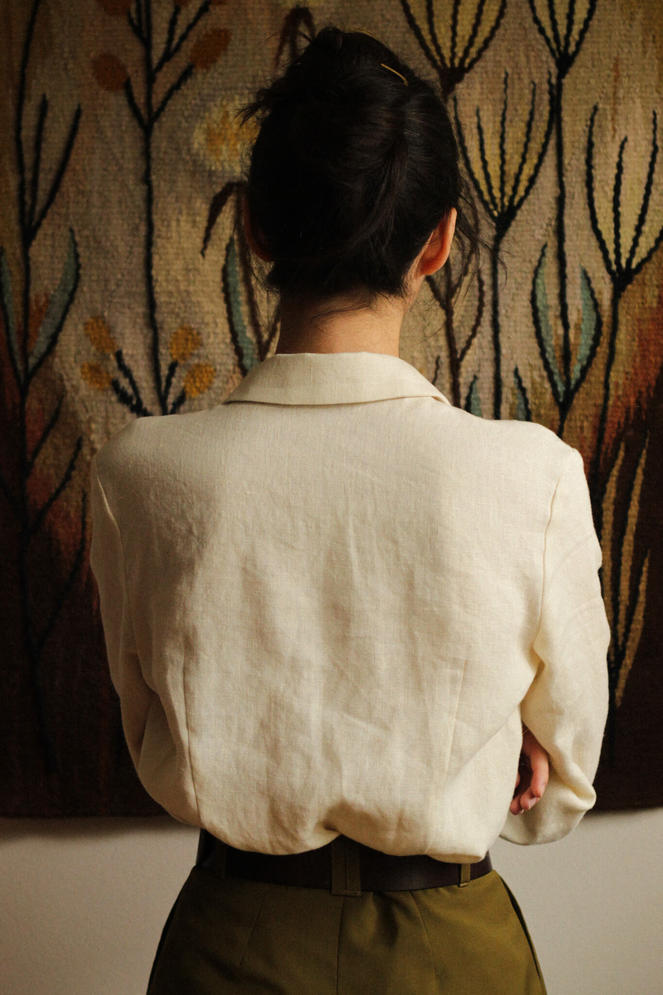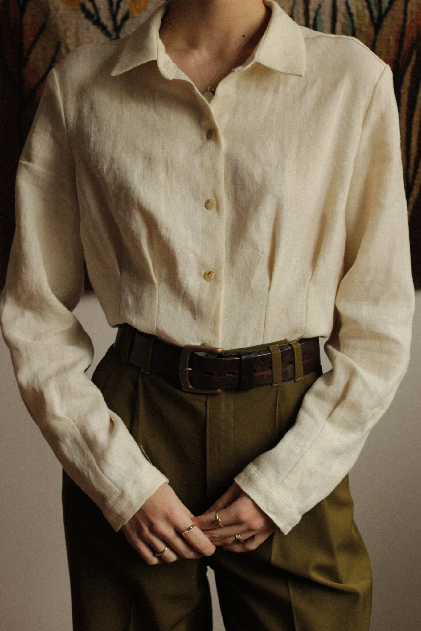 I decided to sew it in the perfect butter yellow toned cream, the Angora Midweight Linen. It has the warmest, glowiest tone to it without being too saturated. A perfect warm toned neutral to wear in these fall days to match with beautiful autumn sunlight! I paired it with my go to buttons – the reverse side of mother of pearl buttons – but I picked out the more yellow toned ones out of my stash to match the shirt. I love how well they go together!