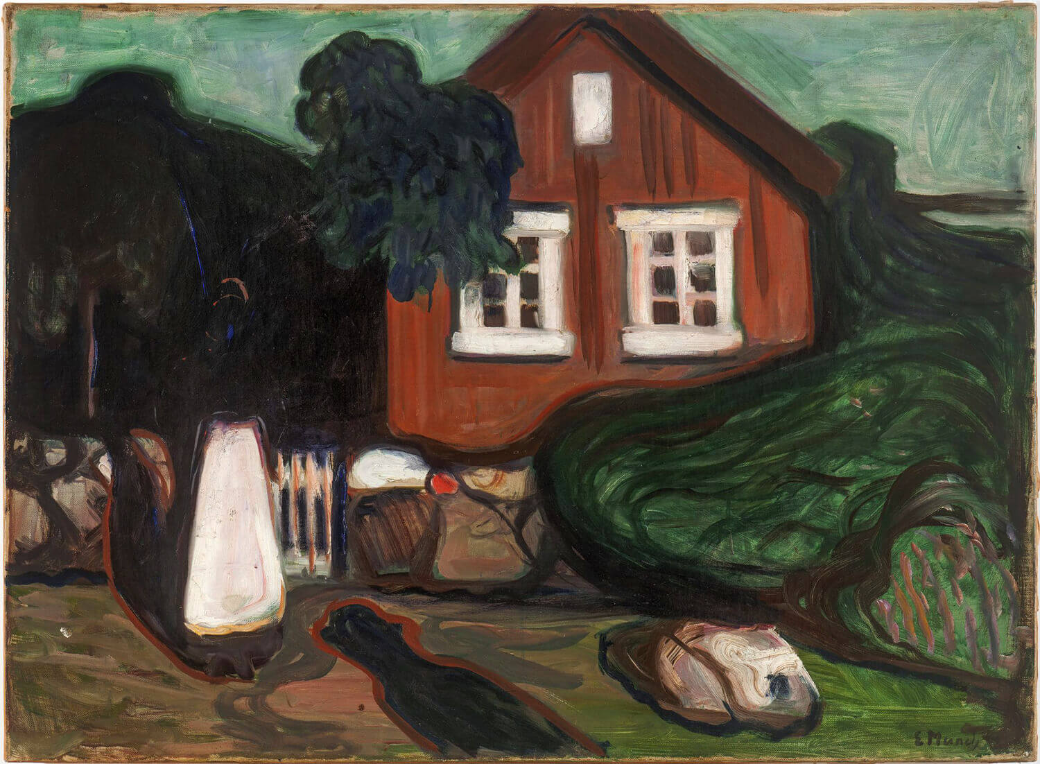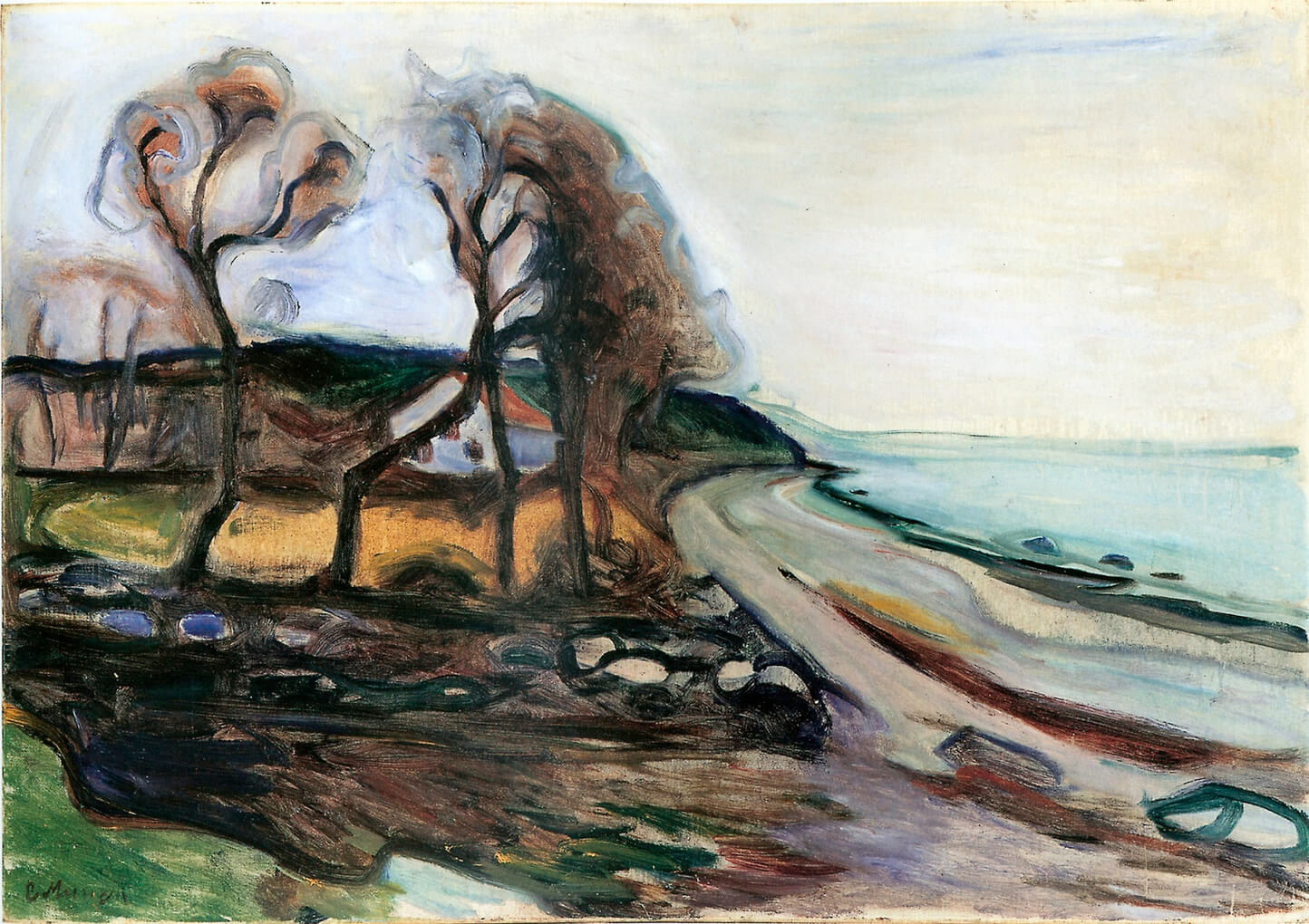In the following years Munch travelled widely throughout Europe, moving between Paris, Berlin, and Kristiania, soaking up influences from the Post-impressionist and Symbolist painters, particularly their expressive brush marks and vivid, heightened colours. He wrote in his notebook, “Painting picture by picture, I followed the impressions my eye took in at heightened moments. I painted only memories, adding nothing, no details that I did not see. Hence the simplicity of the paintings, their emptiness.”