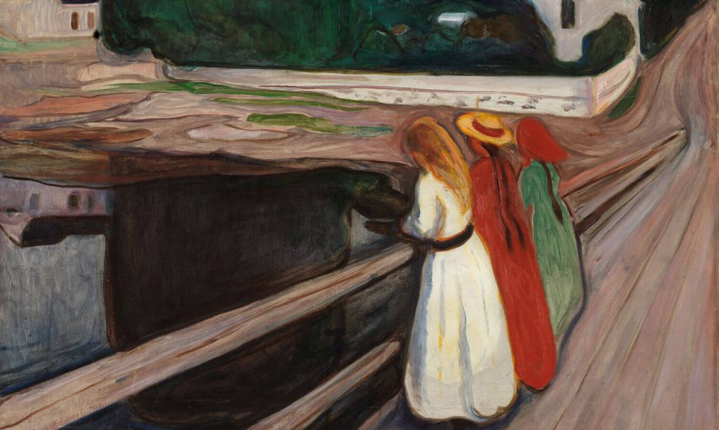 In the slightly later Girls on a Pier, 1901, Munch paints a trio of young women from behind, gazing into still water over a bridge. Sweeping brushstrokes in a pale, sandy hue draw us along the bridge, while the bright vivid tones of the girls’ clothing pull us back to the centre, and contrast sharply with the vast, curved tree shadow that fills the glassy water below, painted in near black brown to add an air of mystery, melancholy, and intrigue.