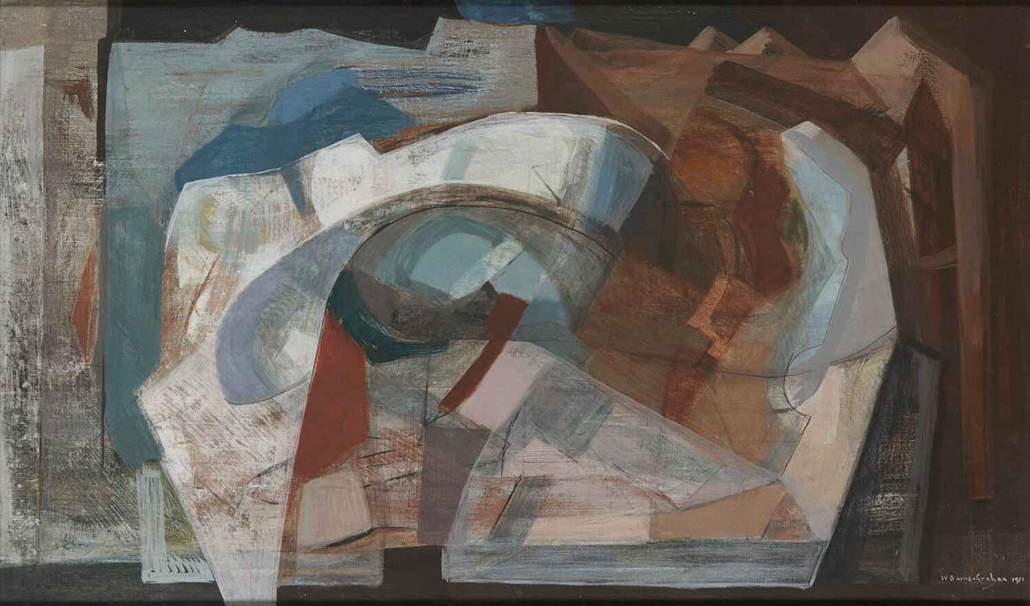 Ice Cavern, 1951 is one such work, an emotive response to the glacier made by the artist in her Cornish studio, which shows the icy, rocky form from a series of overlapping, collapsed angles. She took a Cubist approach to the concept of representation, showing the glacier, as she explained in a letter to Tate Gallery in 1965, “… from above, through, and all around, as a bird flies, a total experience.” Faceted, abstracted forms resembling the jagged and uneven texture of rock rendered in an array of earthy brown hues overlap one another on the right, building up intense layers of atmospheric depth and space, and forming a sharp contrast with passages of crisp white and icy blue.