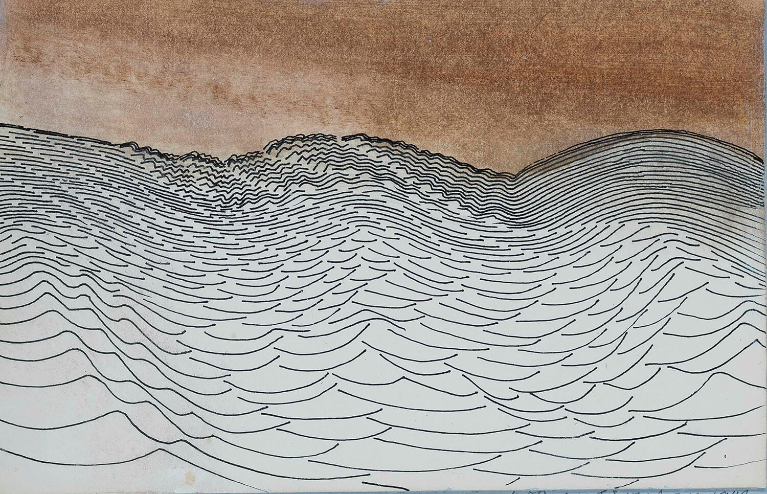 Ever the innovator, Barns-Graham continued to experiment with stylistic techniques, gradually evolving into a more linear, pared back and increasingly abstract style. Made many years later, the strikingly simple Linear Movement, 1982 is one of a series of line drawings exploring repetitive, undulating lines and minimal passages of colour, which she called her “small energy drawings”. Barns-Graham wrote about the series in a letter to a friend in 1981, “These rhythms suggest flowing forms, water, grass and wind movements, or lines for the pleasure of themselves.” This work plays with how the gradual dissipation of lines from the horizon into the water below conveys the rippling texture of water, forming peaks and ridges in a hypnotic, swaying pattern. Overhead, the sky is streaked from left to right in a soft, muted mushroom brown, darkening to the right to suggest the threat of an incoming storm.
